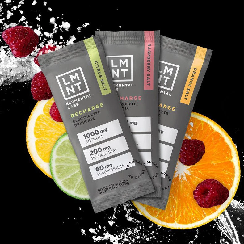 The LMNT Recharge Variety pack is the perfect way for you to find your flavour, or try something new. The LMNT Electrolytes 12 pack features 4 sachets of Citrus Salt, Orange Salt and Raspberry Salt flavours each.Â