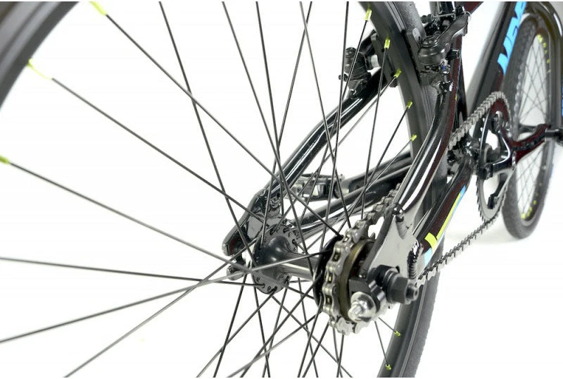 The Mini size Meybo TLNT bike is really well sized – good gearing and top tube for a young rider, with nice, light gearing to help them get through the track with speed.
