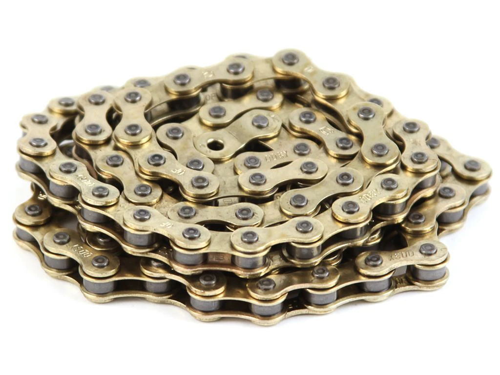 Odyssey took the proven and reliable KMC 510-HX BMX chain and added a permanently attached, factory installed half-link to one end and hey presto, enter the Odyssey Bluebird chain. When the Bluebird chain is trimmed to size you can easily decide whether or not to use the half-link.