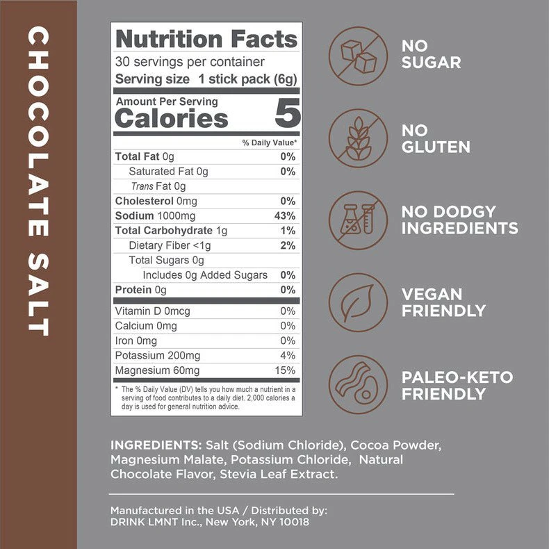 The LMNT Recharge Box comes with 30 packs of LMNT electrolytes in easy to use, single serve sachets. Mix a pack with water to replace electrolytes lost during physical activity and throughout the day.