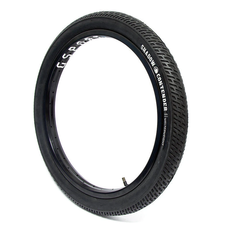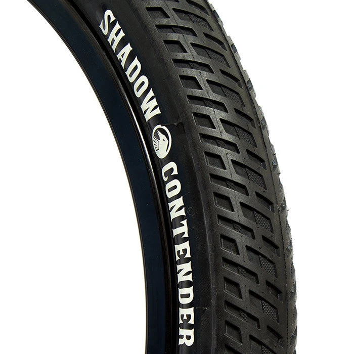 The Shadow Conspiracy Contender tire is the ultimate bowl riders’ tire. With a smooth centerline and specifically designed cut out pattern that wraps the sides so it can roll quick on concrete, ramps, and trails, while gripping hard on taking tight turns and bowl corners.Â